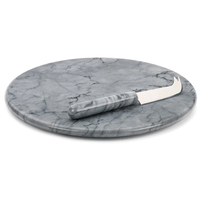Beautiful large round marble cheese board.Comes with a stainless steel and marble matching knife.Rubber feet on the bottom keep the plate securely in place.