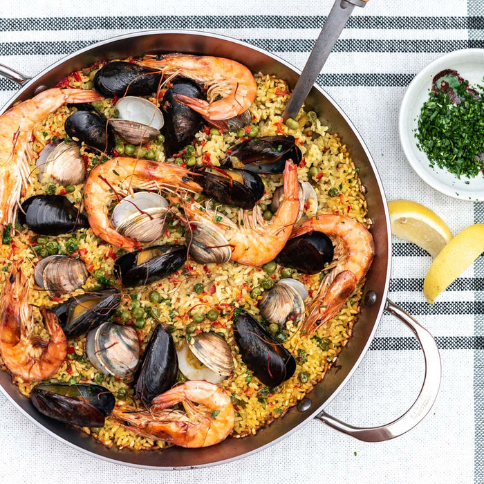 The Mineral B Paella Pan will be your new go-to multi-purpose pan. Make the perfect a paella or pilaf, bake a pan pizza in the oven, or stew up some seafood. The possibilities are endless!