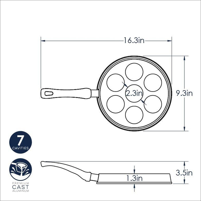 This Ebelskiver Pan from Nordic Ware is made of Cast Aluminum with phenolic handle and features Seven 2.3" cavities.