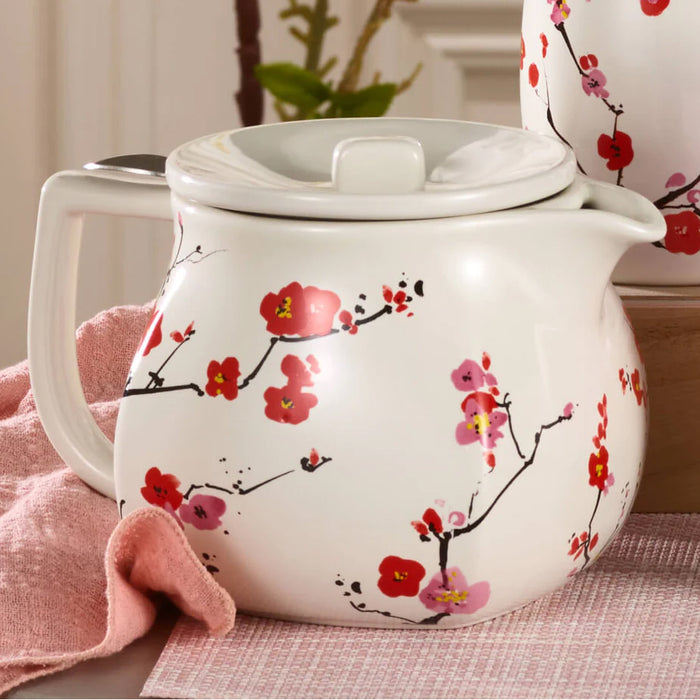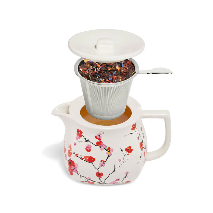 With its enchanting first blooms of spring, the Sakura Fiore Collection recollects a time for rejuvenation and renewal, building on Tea Forte's ever-popular cherry blossom design with red and pink blossoms that awaken the senses. Perfect for brewing tea for two, this 24-ounce teapot includes a stainless-steel infuser basket for steeping your favorite loose tea blends. The snug ceramic lid keeps your tea warm, while the drip-free spout lets you serve with ease.