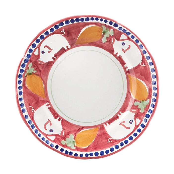 The colorful Campagna Porco Dinner Plate features whimsical handpainted pigs and carrots.