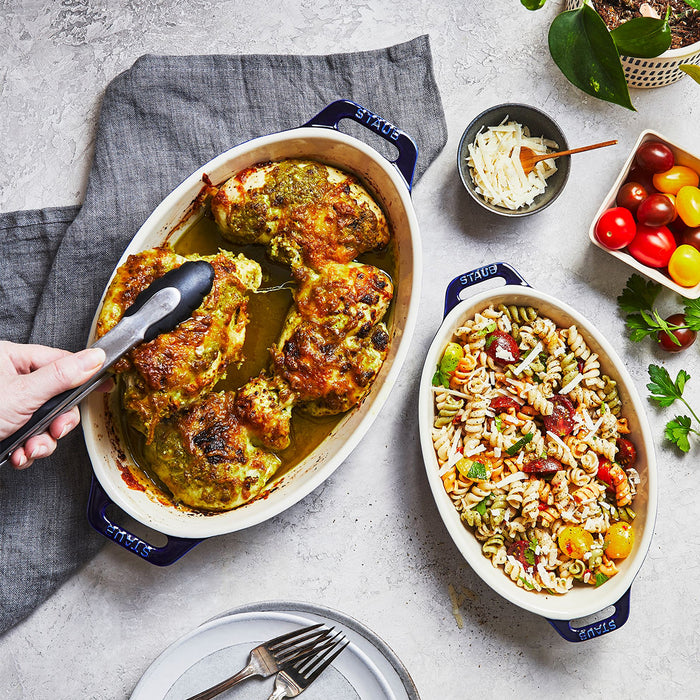 This 2-piece oval baking dish set gently retains heat and won't absorb moisture, producing a delicious result for all your favorite recipes. The comfortable, large handles make maneuvering hot dishes easy. Cook sides and mains, including lasagna, casseroles, and desserts, as well as roasted meats and vegetables. This set offers two of the most essential dishes in the kitchen.