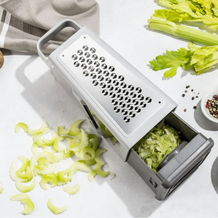 Designed and engineered in Germany, Zwilling Z-Cut offers a unique grating and cutting technology to help you get your prep work done effortlessly. Thanks to the integrated, sharp 2-way cutting functionality combined with the unique Z-cut cutting blade teeth design, you get better grating results, faster. Z-cut was engineered using the long tradition of cutting expertise that only ZWILLING can offer. From fine and medium grating, to coarse grating, and slicing, you can enjoy more output, with less effort. Each tool boasts a sleek minimalist design that offers the utmost in comfort and ergonomics. And the slip-proof design makes Z-Cut safe and easy to use. All Z-Cut components are dishwasher safe.