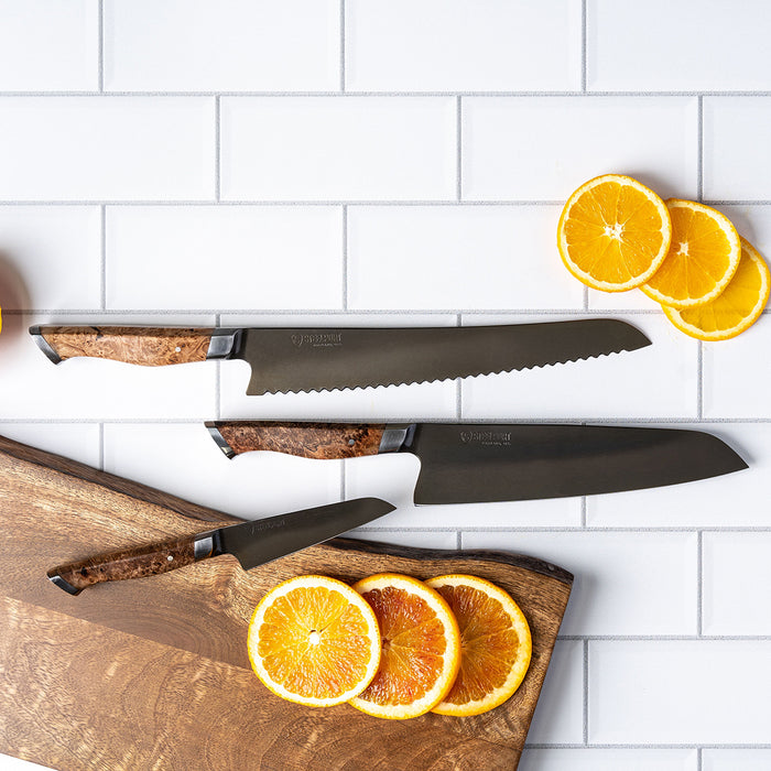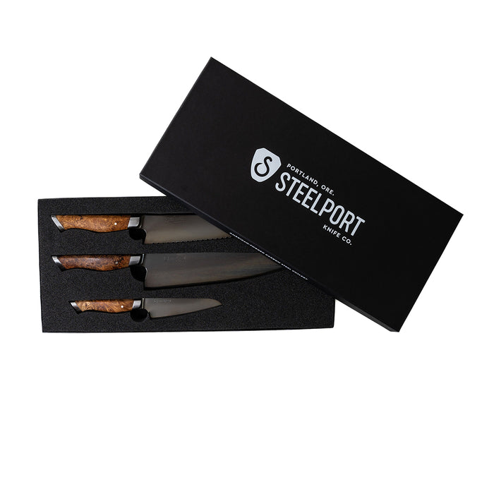 STEELPORT’s 3-Piece Essential Gift Set features the three most used knives in the average home kitchen. This set is sold in a single custom box holding all three knives, ideal for gift-giving.