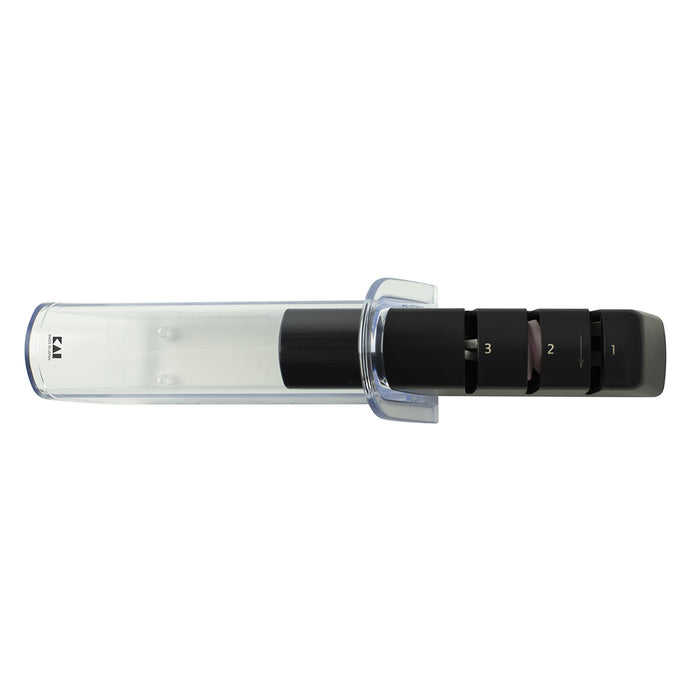 The Kai Diamond and Ceramic Retractable Sharpener sharpens knives easily with a simple 3-step process. The left- or right-handed sharpener is set to the 16-degree angle required to sharpen any Kai straight-edged, double-bevel blade. Just pull the knife through the first slot for rough sharpening, the second slot for refinement, and the third slot for finishing. Your knife's razor sharpness is restored and ready to go to work. Includes retractable cover for easy, compact storage.