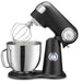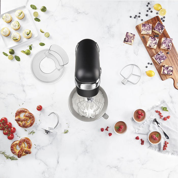 Includes chefs whisk, dough hook, flat mixing paddle, and splash guard with pour spout