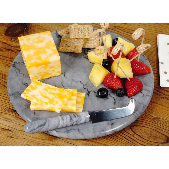 Beautiful large round marble cheese board.Comes with a stainless steel and marble matching knife.Rubber feet on the bottom keep the plate securely in place.