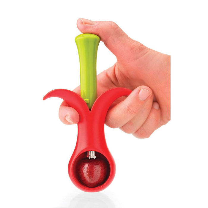 - Joie's Blossom Cherry Pitter easily removes the pit from all types of cherries in just seconds