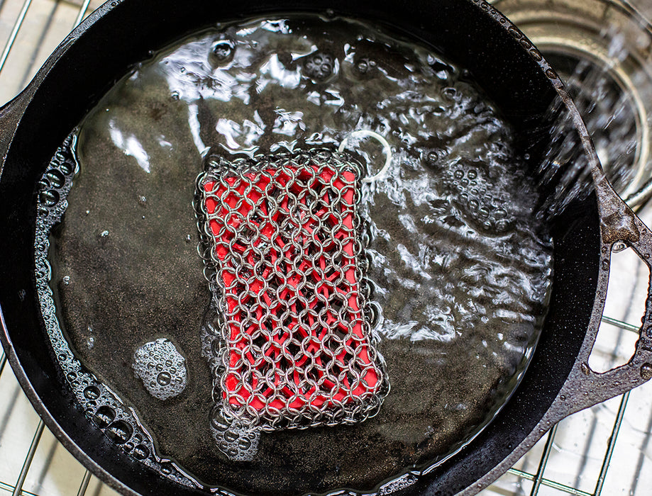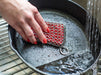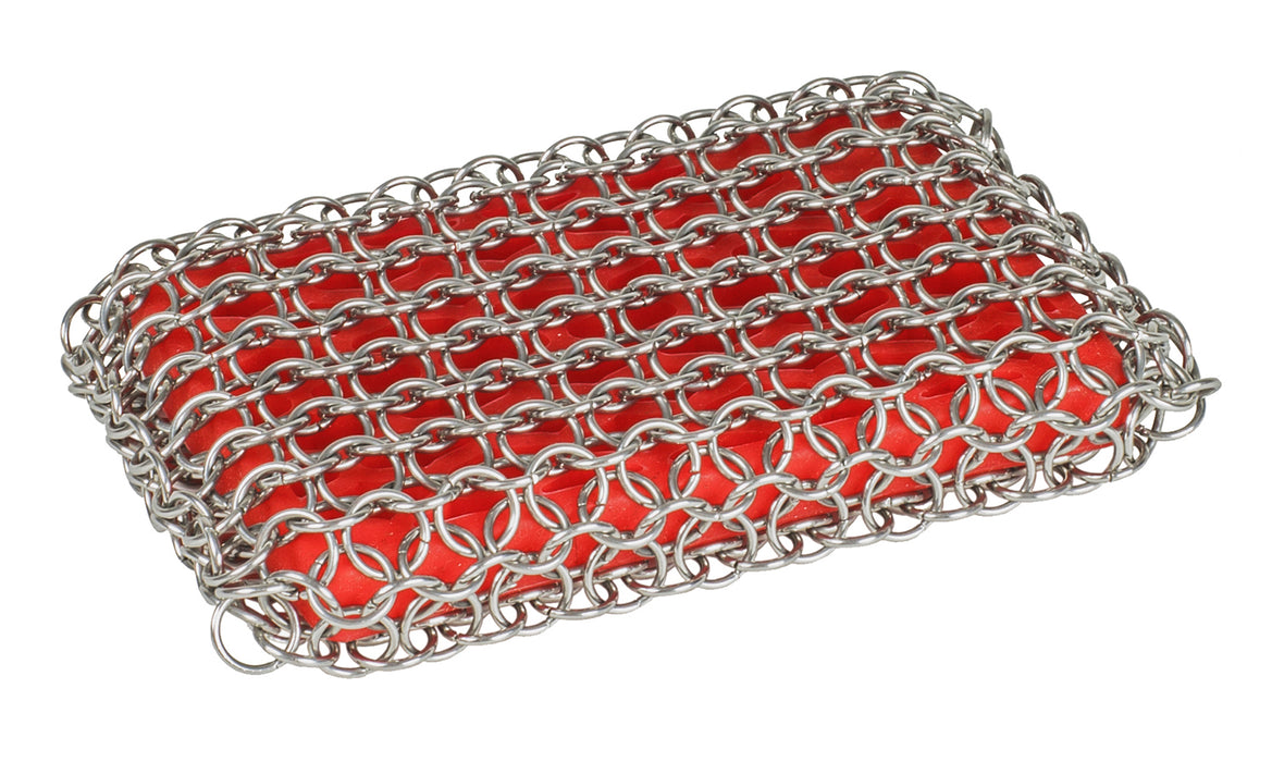 This silicone scrubbing pad has stainless steel chainmail rings, creating a textured surface, ideal for heavy-duty cleaning. Removes stubborn food easily, without removing seasoning from cast iron and carbon steel cookware. Dishwasher safe. Made in China.
