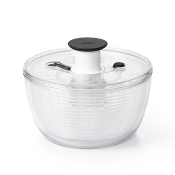 The OXO Good Grips Little Salad and Herb Spinner is the quick and easy way to dry a single serving of salad or a handful of herbs. For clean, dry ingredients, just press the soft, non-slip knob. The spinning basket doubles as a colander, so you can rinse lettuce and more with ease. The non-slip base prevents skidding, and the patented built-in brake button stops the Spinner on a dime for unloading. Toss and serve your salad right in the bowl: The durable dish is crystal clear and moves seamlessly to the table. Simply slide the lock to hold the pump flush with the lid for compact storage. The lid comes apart for thorough cleaning. Bowl capacity is 3 qt/2.84 L; basket capacity is 2.44 qt/2.31 L. Dishwasher safe.
