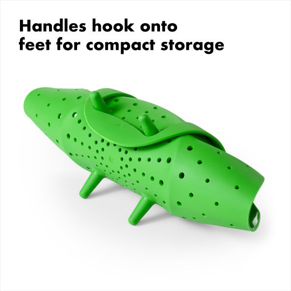 High walls and a flat center make the Silicone Steamer perfect for large food, while flexible pleats let it fit a variety of pot sizes. Handles fold in to accommodate pot lid and stay cool to the touch for safe removal. One-piece construction for easy cleaning. Rolls up for compact storage.