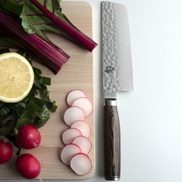 Quite simply, nakiri is Japanese for "vegetable knife." If you havent used Japanese-style knives before, the nakiri is sure to attract your attention due to its interesting shape. Yet this blade shape is quite practical, too. With its blunt tip, the Shun Premier Nakiri is safer to use in the kitchen, but without sacrificing any of the slicing and dicing power you need when processing vegetables. Because of its straight blade, edge, and spine, the nakiri isnt rocked like a chef's knife. Instead, use a push cut by moving the knife down and forward while keeping the edge parallel to the cutting surface. If you cut vegetables for salad or stir-fry, you will simply love using the Shun Premier Nakiri.
